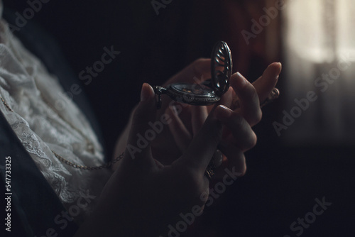 Female hands hold vintage round clock, steampunk style, closeup