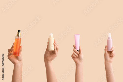 Female hands with different cosmetic products on beige background