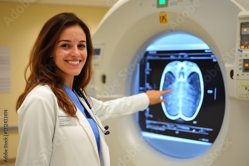 Female hispanic young doctor explains chest x-ray in medical imaging room