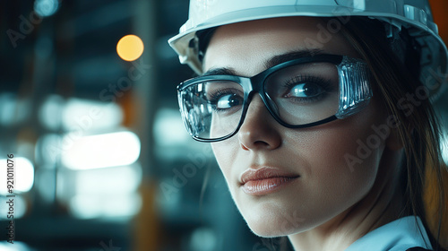 Female industrial worker in a white helmet and glasses, shown in a realistic and cinematic eye-level shot, with accent lighting highlighting her presence in an industrial building.