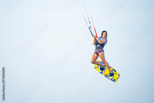 Female kitesurfer performing a jump over the ocean in La Guajira