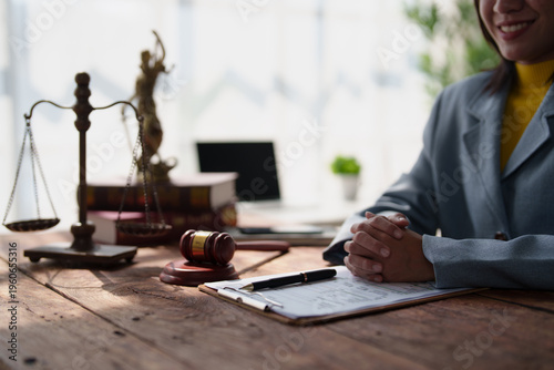 Female lawyer sitting at a wooden desk with a justice scale, gavel, and legal documents, offering professional consultation and representing the concept of law and justice
