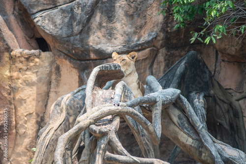 female lion sitting in the wood