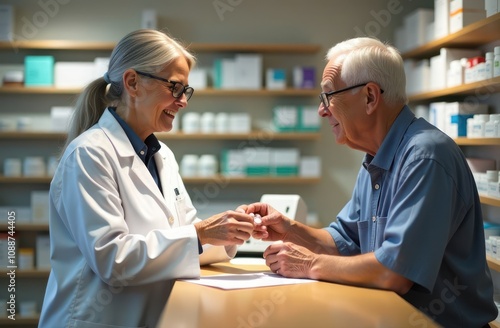 female pharmacist handing over medication to elderly male patient at pharmacy counter. healthcare, pharmacy work, customer service