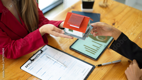 Female real estate broker holding house model with client.
