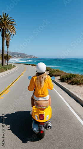 Female riding yellow scooter along coastal road with ocean view