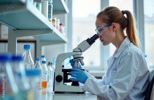 Female scientist carefully examines sample under microscope in modern laboratory. Research focus on vaccine development. Scientist wears protective gear, looks intently at microscope. Laboratory