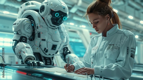 Female Scientist Signing a Document in a Futuristic Laboratory With a White Robot
