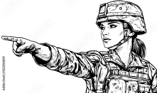 Female soldier pointing, army personnel, command gesture, linear icons set, vector.