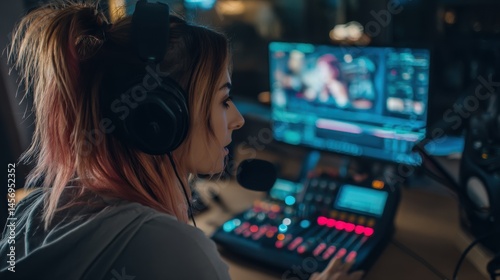 Female Streamer Adjusting Sound on Professional Mixer in Home Gaming Studio While Engaging in FPS Gameplay with Team on Open Chat