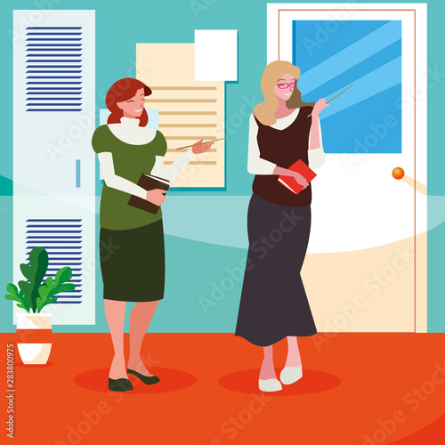 female teachers couple with textbooks in school corridor