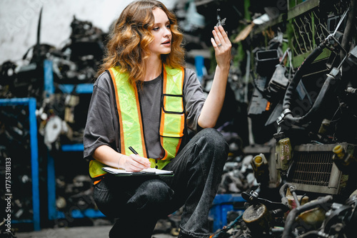 Female technician examine used car damaged engine block at scrapyard warehouse recycle scrap part. Beautiful woman engineer inspecting rust oily auto motor old spare part in junkyard for reuse service