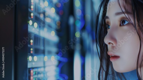 Female technician in a server room working on a laptop, focusing on software updates, cybersecurity, and network management while configuring a firewall and database