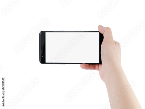 female teen hand holding smartphone with blank screen isolated on white