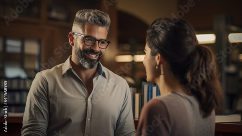 Female University Or College Student In Library Talking With Teacher
