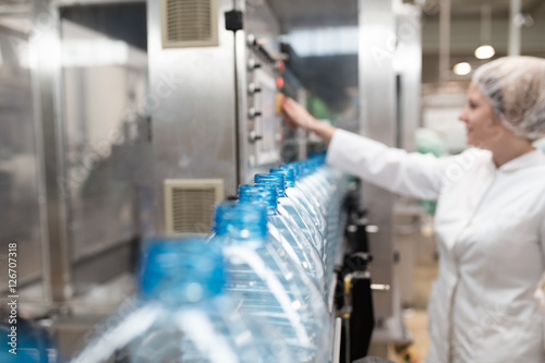 Female worker in factory checking robotic line for water bottling and packing. Inspection of quality control.