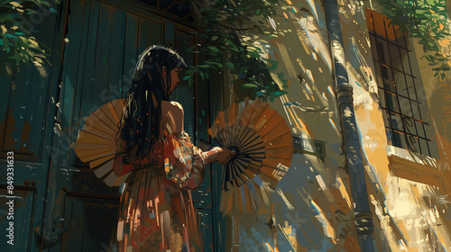 Femme posant avec deux éventails devant un bâtiment en pierre, touriste l'été en vacances à Paris ou dans une capitale historique