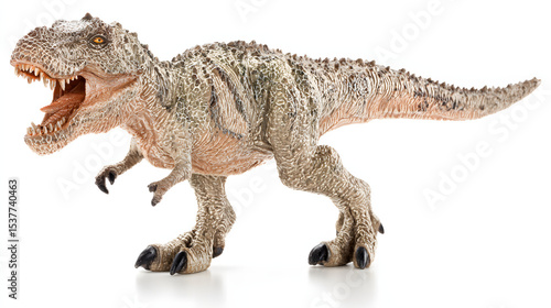 Ferocious T-Rex figurine with detailed scales and teeth, isolated on white, conveying primal power and prehistoric terror.