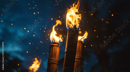festival Tiki torches illuminate the night sky.