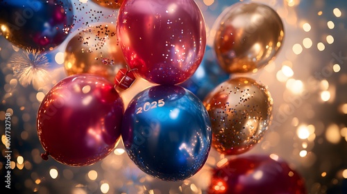 Festive "2025" New Year’s balloons with sparkling decorations and bright lights, creating a vibrant and celebratory atmosphere. This eye-catching scene captures the excitement and joy of welcoming