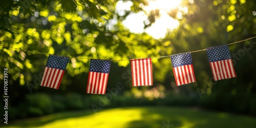 Festive American Flags Garland Outdoors with Green Foliage and Sun
