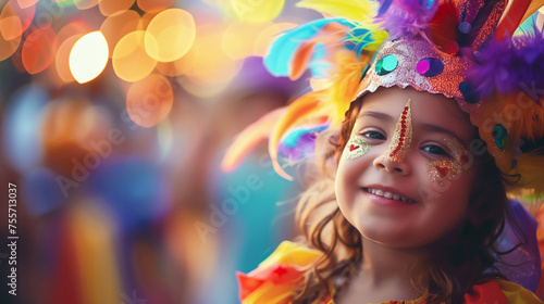 Festive banner with joyful child in carnival costume with colorful feather headdress and glitter makeup smiling at festive event. Generative AI