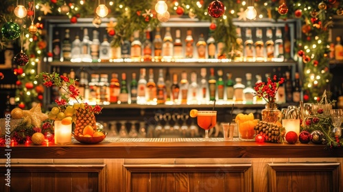 Festive bar with colorful holiday decorations, assorted drinks, and a variety of fruits, creating a warm and inviting atmosphere.