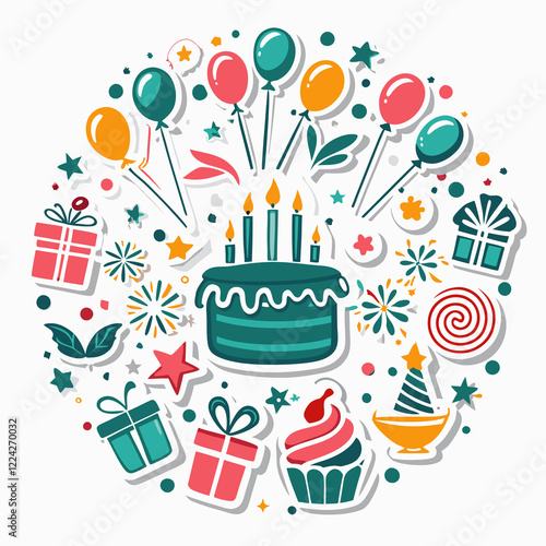 Festive birthday party elements in a circle.