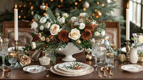 Festive Christmas Dinner Setting: Joyful Holiday Table with Candle and Decorations