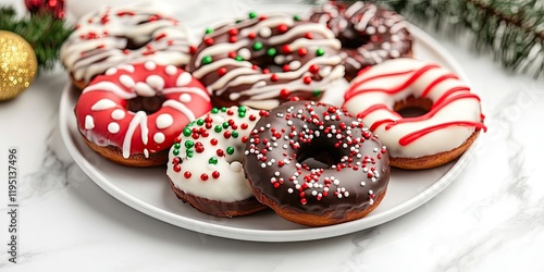 Festive Christmas donuts on a round white plate with red, green, and white decorations against a stylish white marble background.