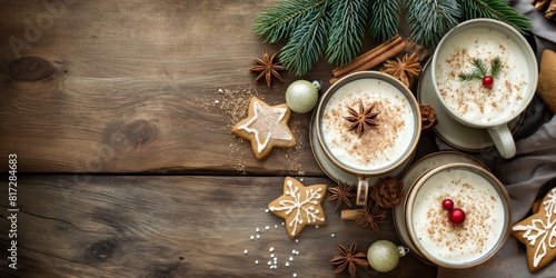 Festive Christmas eggnog in white cups with cinnamon, surrounded by holiday decor