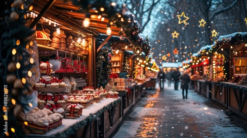 Festive Christmas market with decorated stalls, twinkling lights, and a cozy winter atmosphere. People enjoy shopping in the seasonal delight.