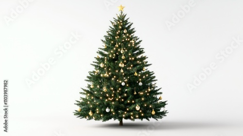 Festive Christmas Tree 3D Render with Twinkling Lights, Ornaments, and Garlands on Isolated White Background - Ultra-Detailed Illustration