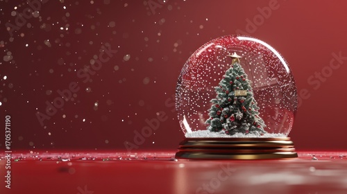 Festive Christmas tree in a snow globe with a red background for holiday season