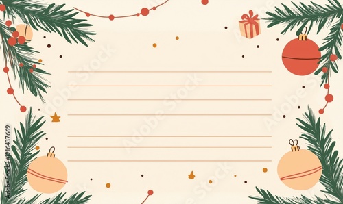 Festive Christmas-themed blank note card with decorative elements including pine branches, ornaments, and gift box