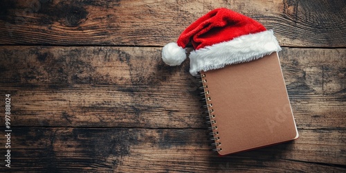 Festive Close-Up of a Red Notebook with Santa Hat on Rustic Wooden Table Surrounded by Holiday Decorations, Merry Christmas with sweet memories