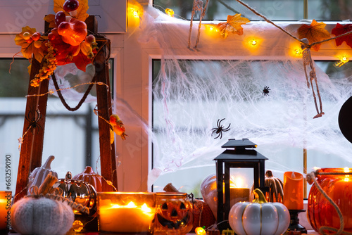 Festive decor of the house on the windowsill for Halloween - pumpkins, Jack o lanterns, skulls, cobwebs, spiders, skeletons, candles and a garland - a cozy and terrible mood