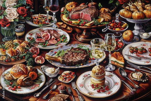 Festive Dinner Table With Roasted Steaks, Desserts, and Appetizers