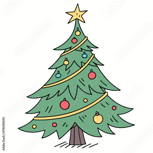 Festive Evergreen: A hand-drawn Christmas tree adorned with ornaments and a star, capturing the spirit of the holiday season.