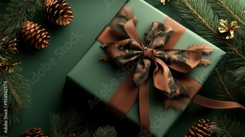 Festive green gift box with pine branches on dark background, top view Christmas concept