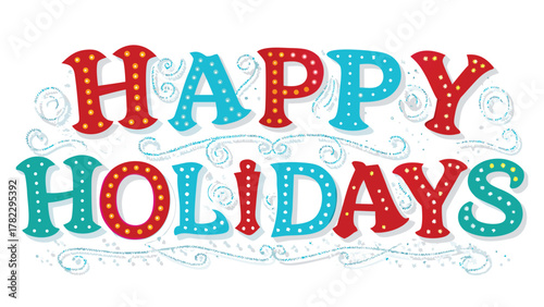 Festive happy holidays text in bold red and teal marquee letters with glowing bulbs and decorative swirls