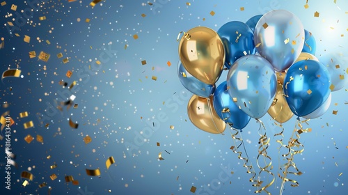 Festive Holiday Background with Golden and Blue Metallic Balloons, Confetti, and Ribbons for Celebrations