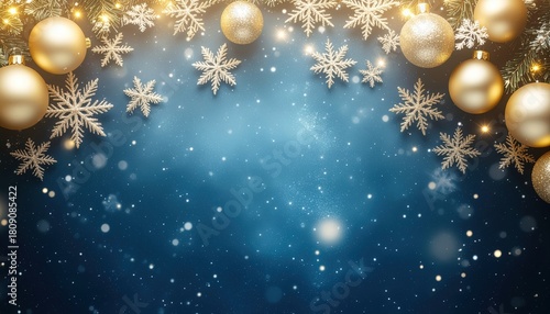 Festive holiday celebration winter wonderland decorative image magical atmosphere close-up view christmas ornaments and snowflakes glimmering against a blue background