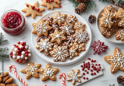 Festive Holiday Cookies Display on a Marble Surface with Pine Cones, Red Berries, and Decorative Elements for a Cheerful Seasonal Celebration