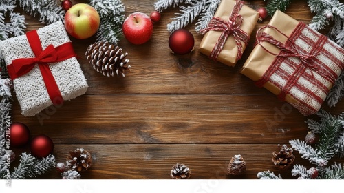 Festive Holiday Scene with Red and Gold Gifts, Green Pine Branches, Bright Red Apples, and Natural Pine Cones on Rustic Wooden Table