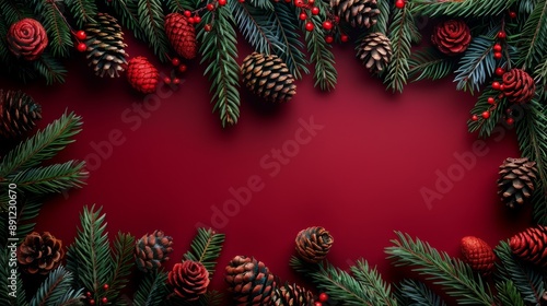 Festive Pine Cones and Leaves on Deep Red Background - Holiday Banner Design