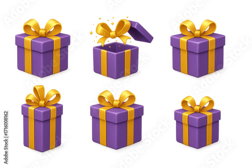 Festive purple and gold gift boxes with bow in 3d style for celebrations
