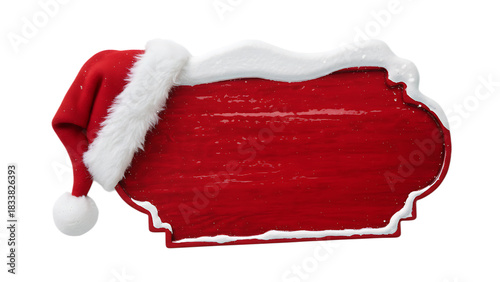 Festive red wooden sign with santa hat and snow for christmas holiday season