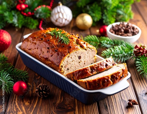 Festive sliced meatloaf in a baking dish, surrounded by Christmas decorations