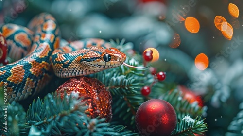 Festive Snake Among Christmas Decorations with Bokeh Lights